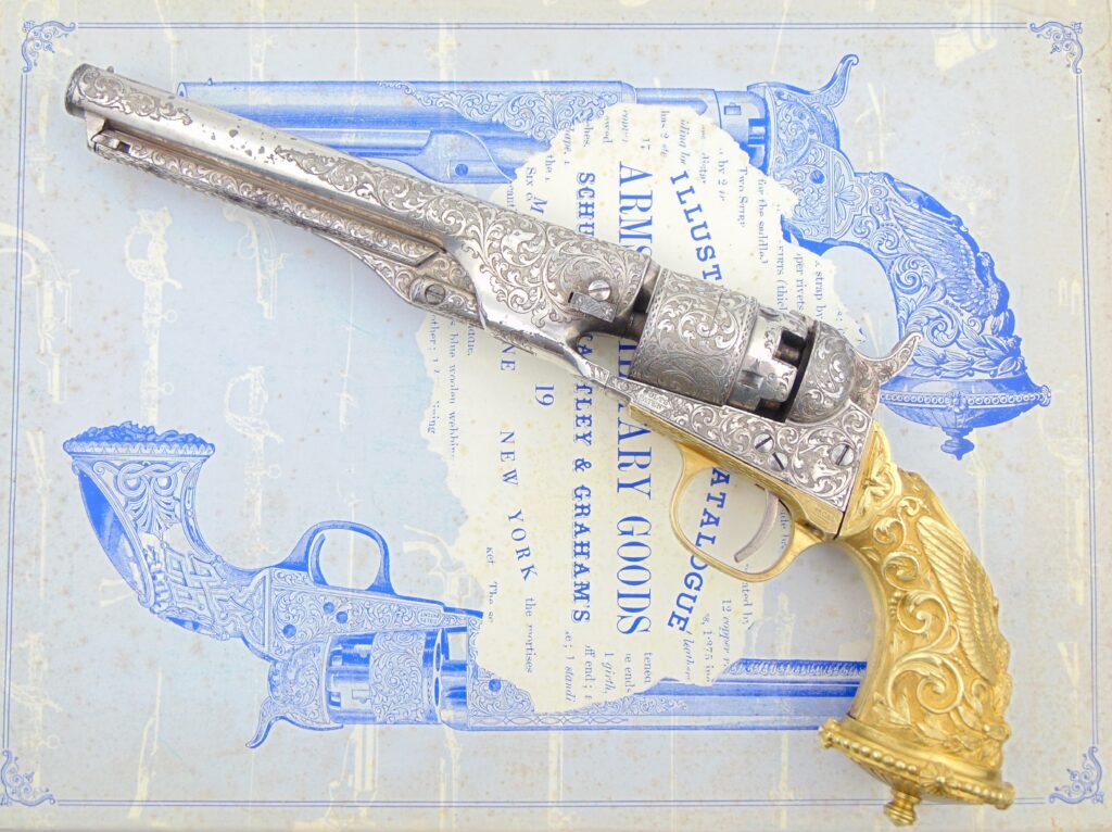 An interesting 1860 Army, originally part of a U.S. Government Shipment in late 1863 & subsequently period embellished. Revolver retains very little original finish. Engraving is of very high quality, featuring an extremely well executed vine, scroll, and floral layout. Engraving also features checkerboard and punch dot fills that perfectly accent the scroll. Checkerboard style […]