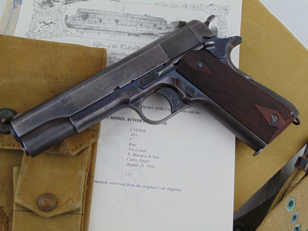 Highly unusual & seldom seen Egyptian contract Colt Government model. This pistol retains some blue, but exhibits finish wear throughout. Minimal pitting and corrosion. Pistol is now fitted with a close time period USGI slide with similar wear, bearing serial number 745057, rather than its original commercial slide. Mechanically sound. Right front bow of triggerguard […]