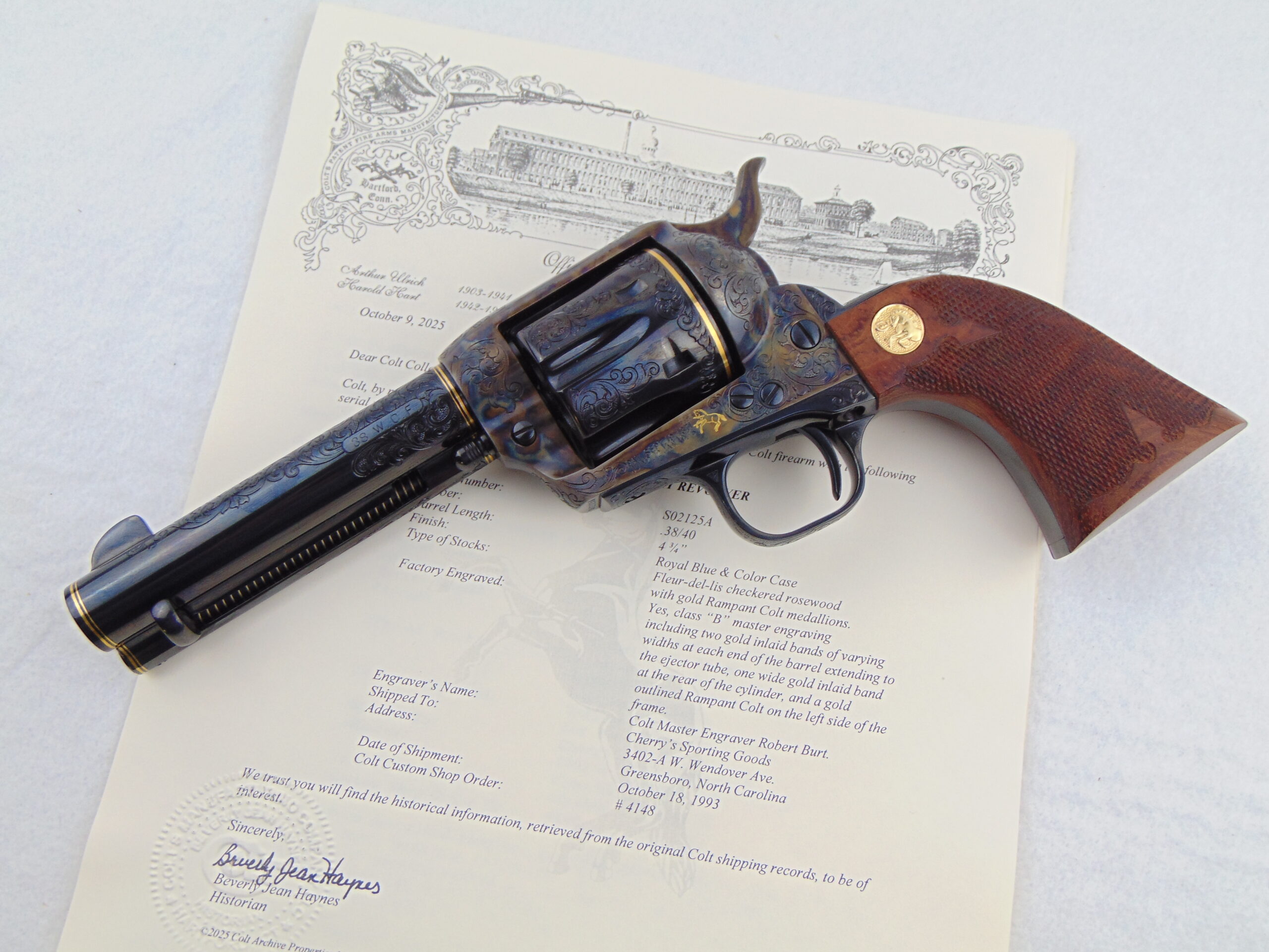 Excellent Bob Burt Factory Colt Master engraved 3rd generation Single Action Army. This masterpiece by one of Colt’s most accomplished engravers features “B” coverage scroll on the frame, barrel, cylinder, triggerguard, and backstrap. Gold inlaid bands on the barrel, ejector tube, and rear of cylinder complement the engraving and the gold inlaid Rampant Colt on the left side of the frame. Revolver features perfectly fitting Colt factory fleur-de-lis checkered rosewood stocks and is finished in Colt’s Royal Blue and color case. Completing the revolver is Mr. Burt’s signature, prominently featured on the underside of the barrel.