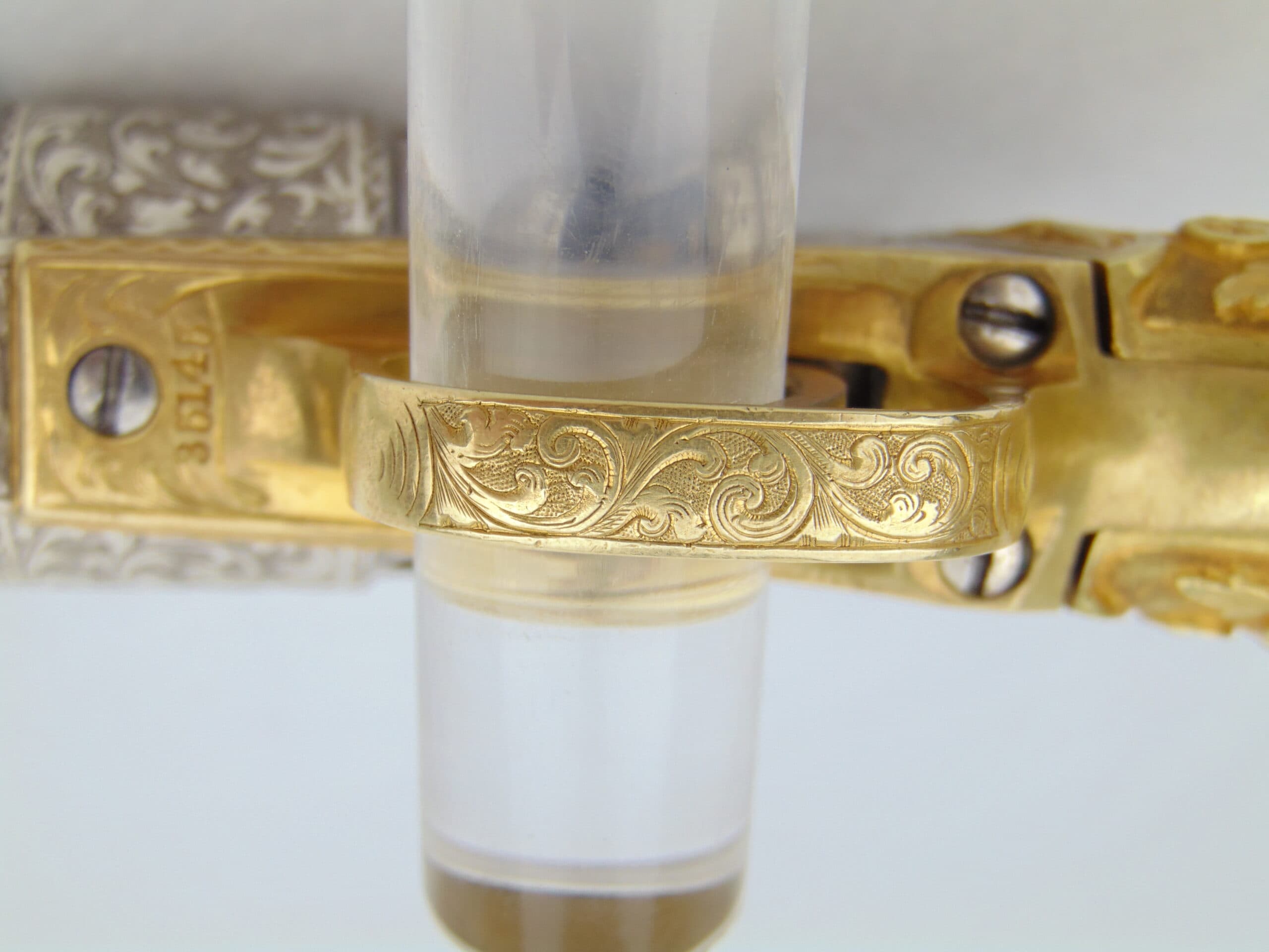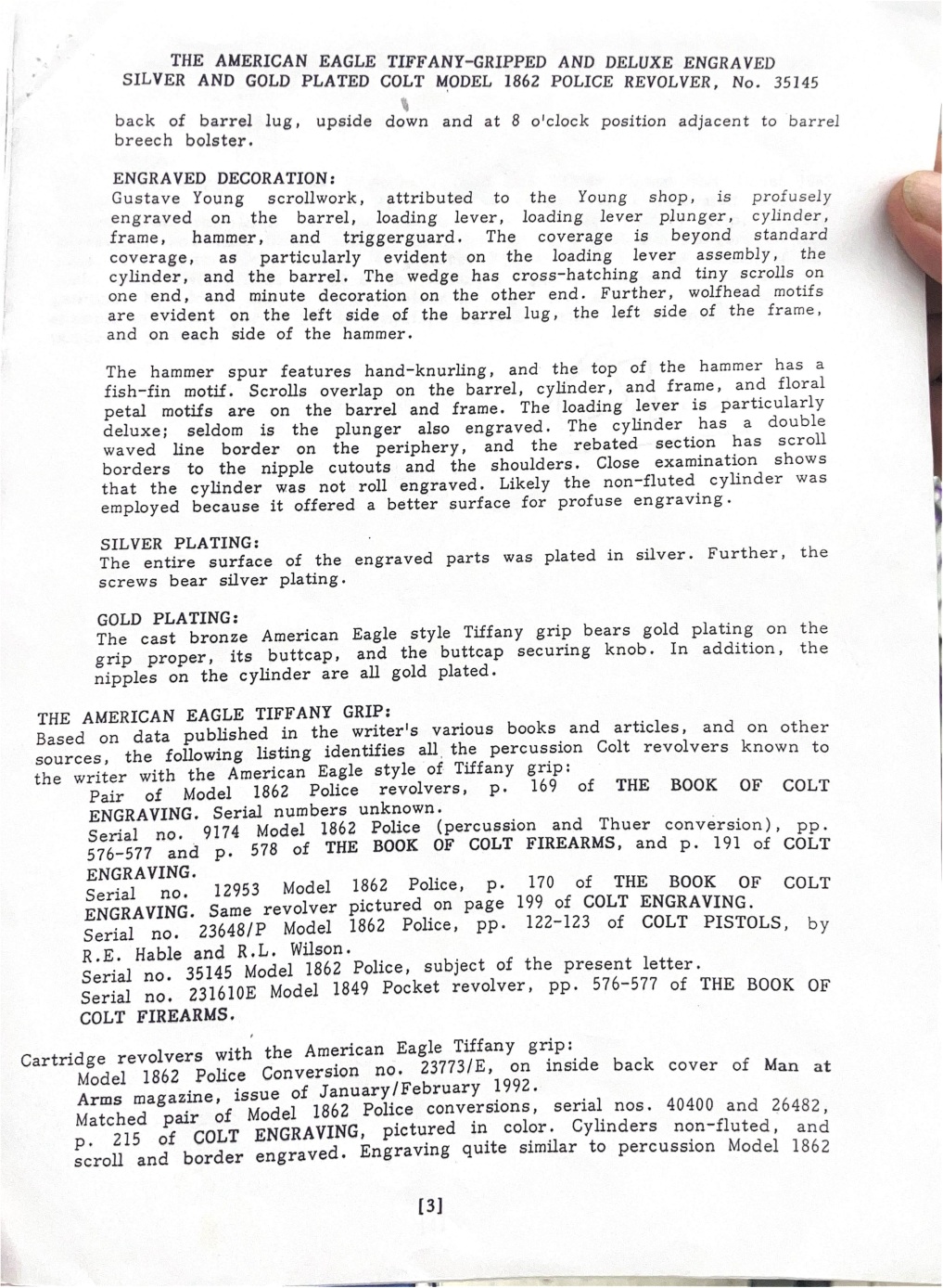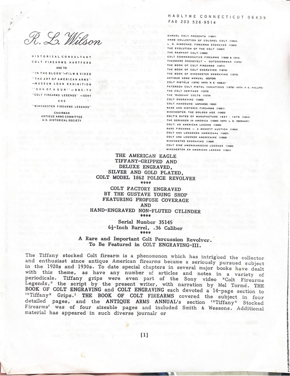 The engraving was originally attributed to Colt factory work by Gustave Young in an evaluation performed by R.L. Wilson (pictured), however, upon further evaluation & consult, it is of the opinion of this author that the engraving is more likely to be Louis Nimschke or Georg Sterzing, however we cannot definitively identify the engraver.