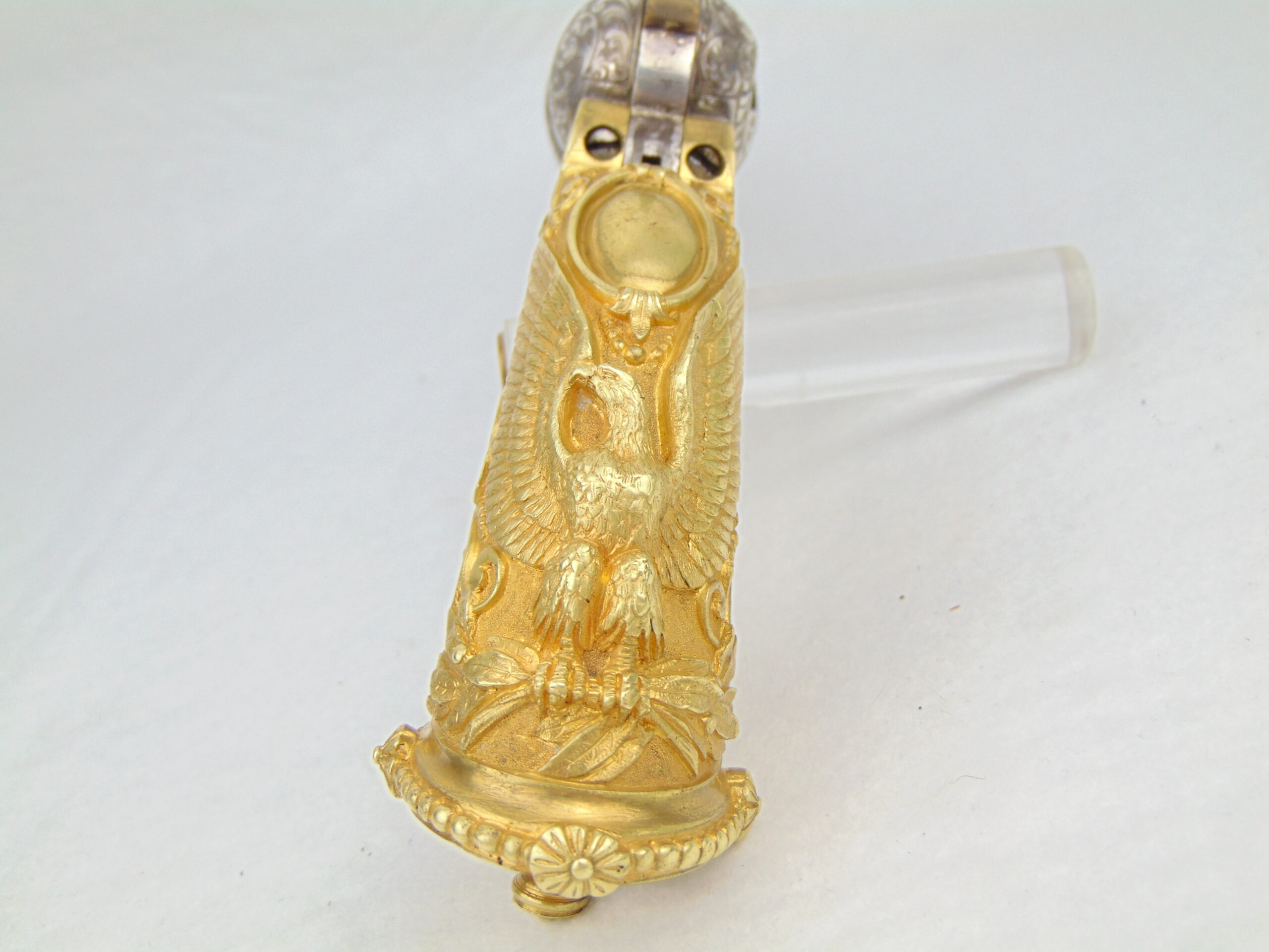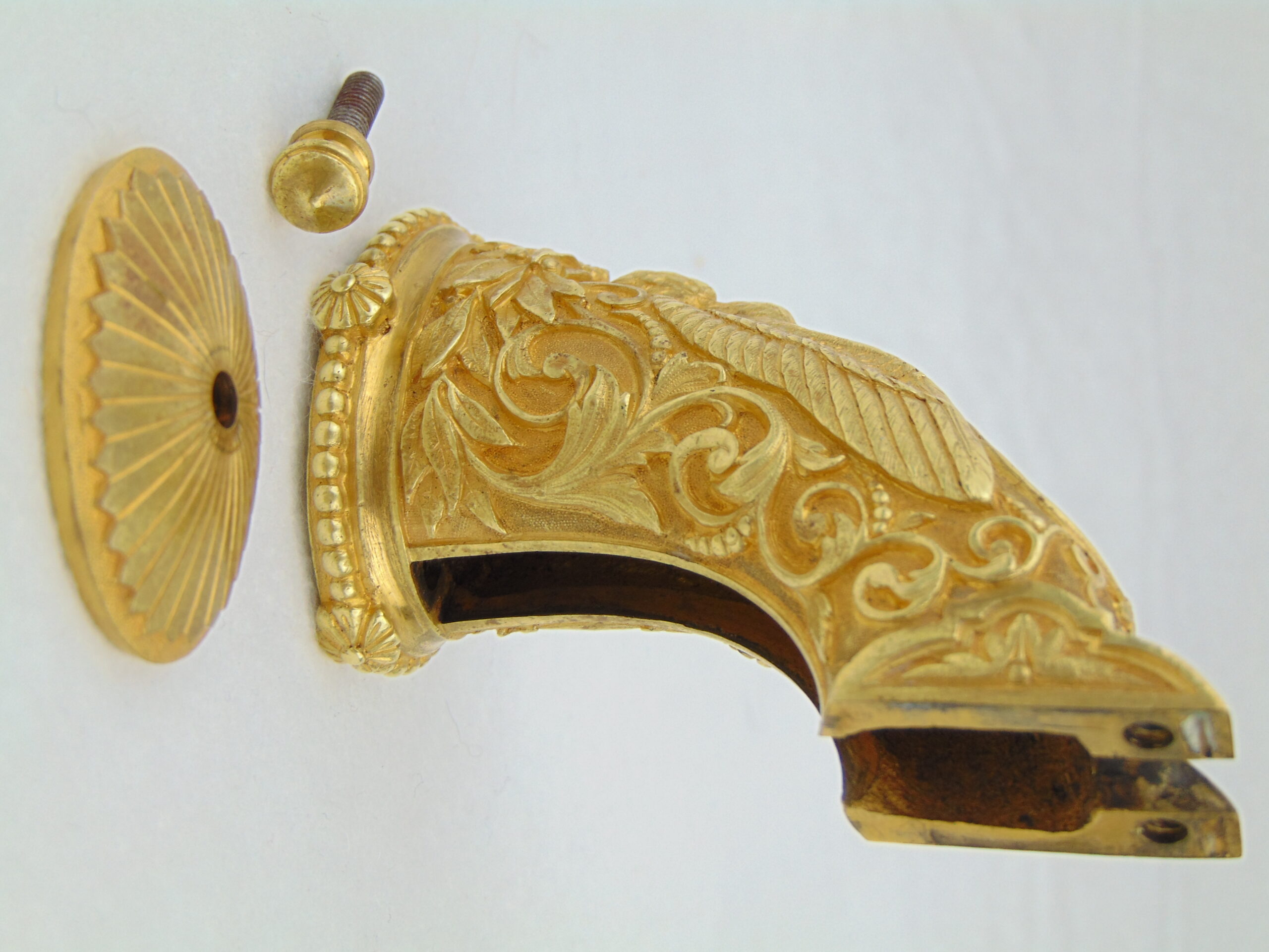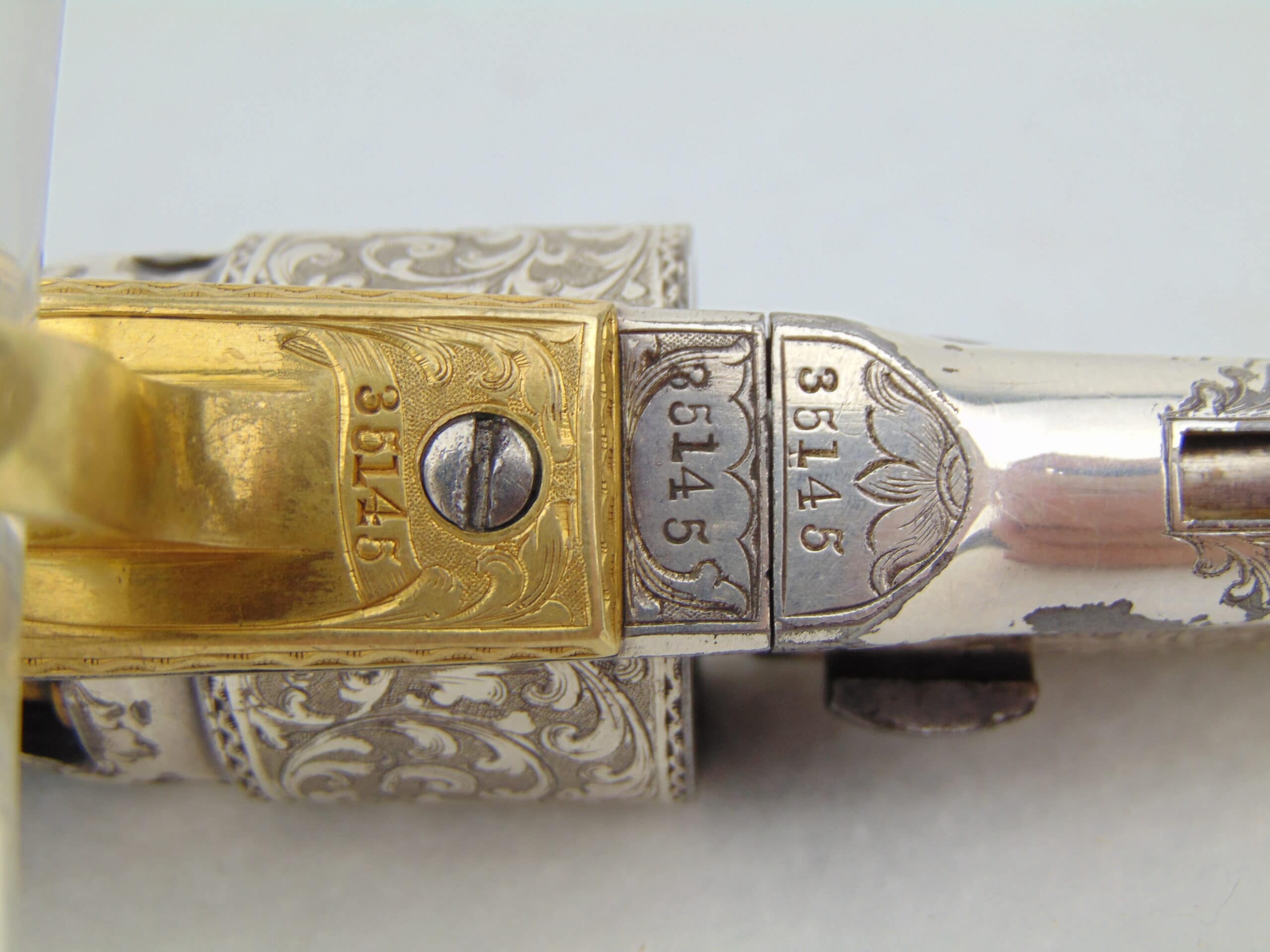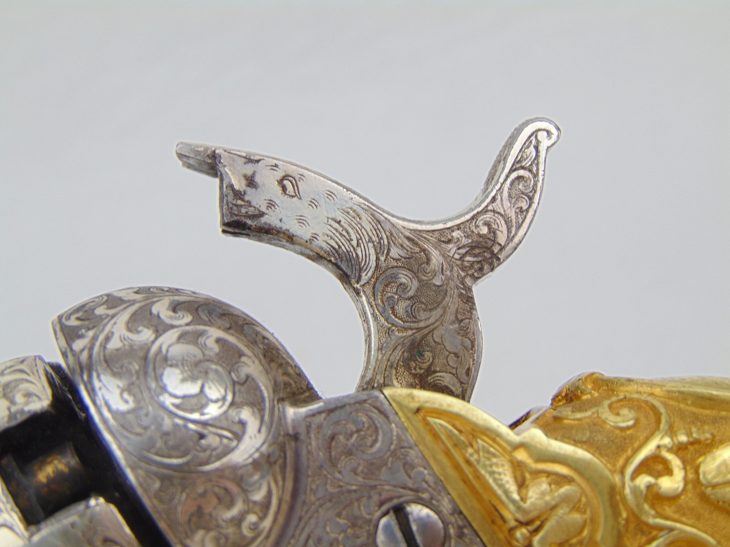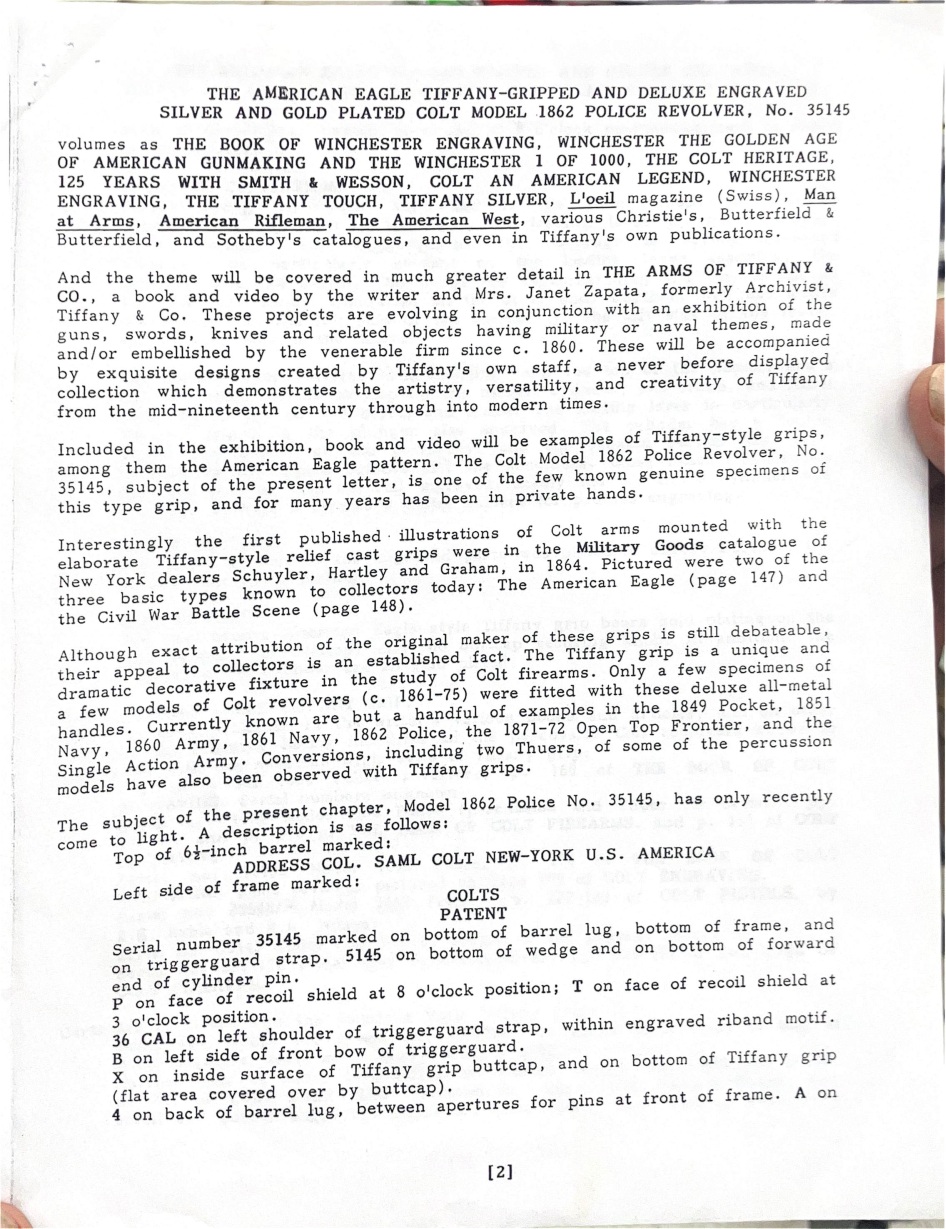 This Colt is fitted with a pair of cast bronze, gold plated, Tiffany eagle grips. These grips, according to R.L. Wilson evaluation, are genuine Tiffany – recent consult on these grips has been inconclusive. We encourage any serious potential buyers to carefully review the photos of these grips, and to ask us for any more information about them to make an informed decision on their authenticity.