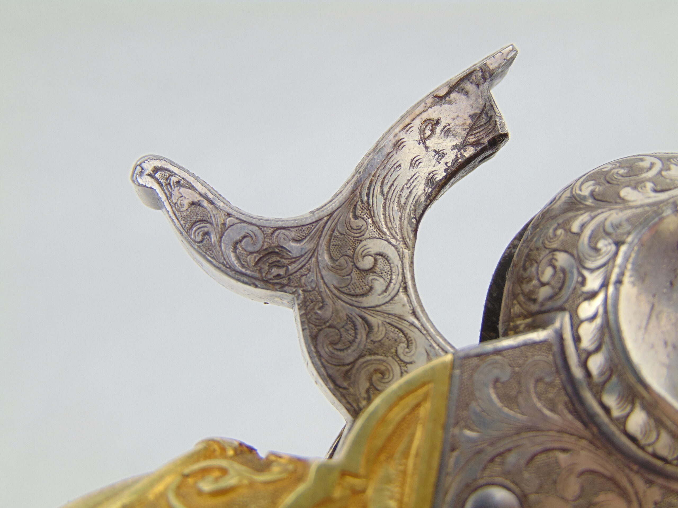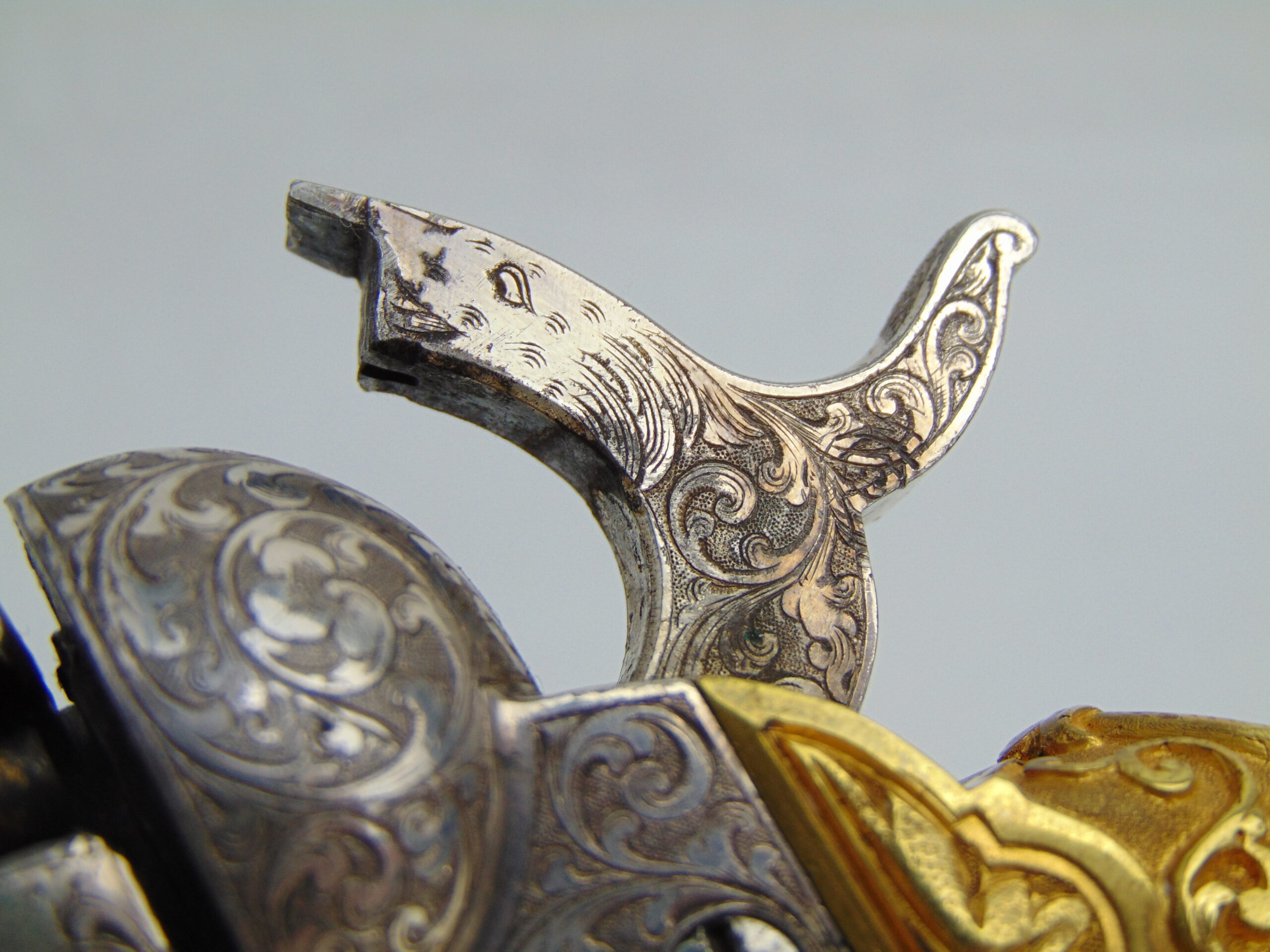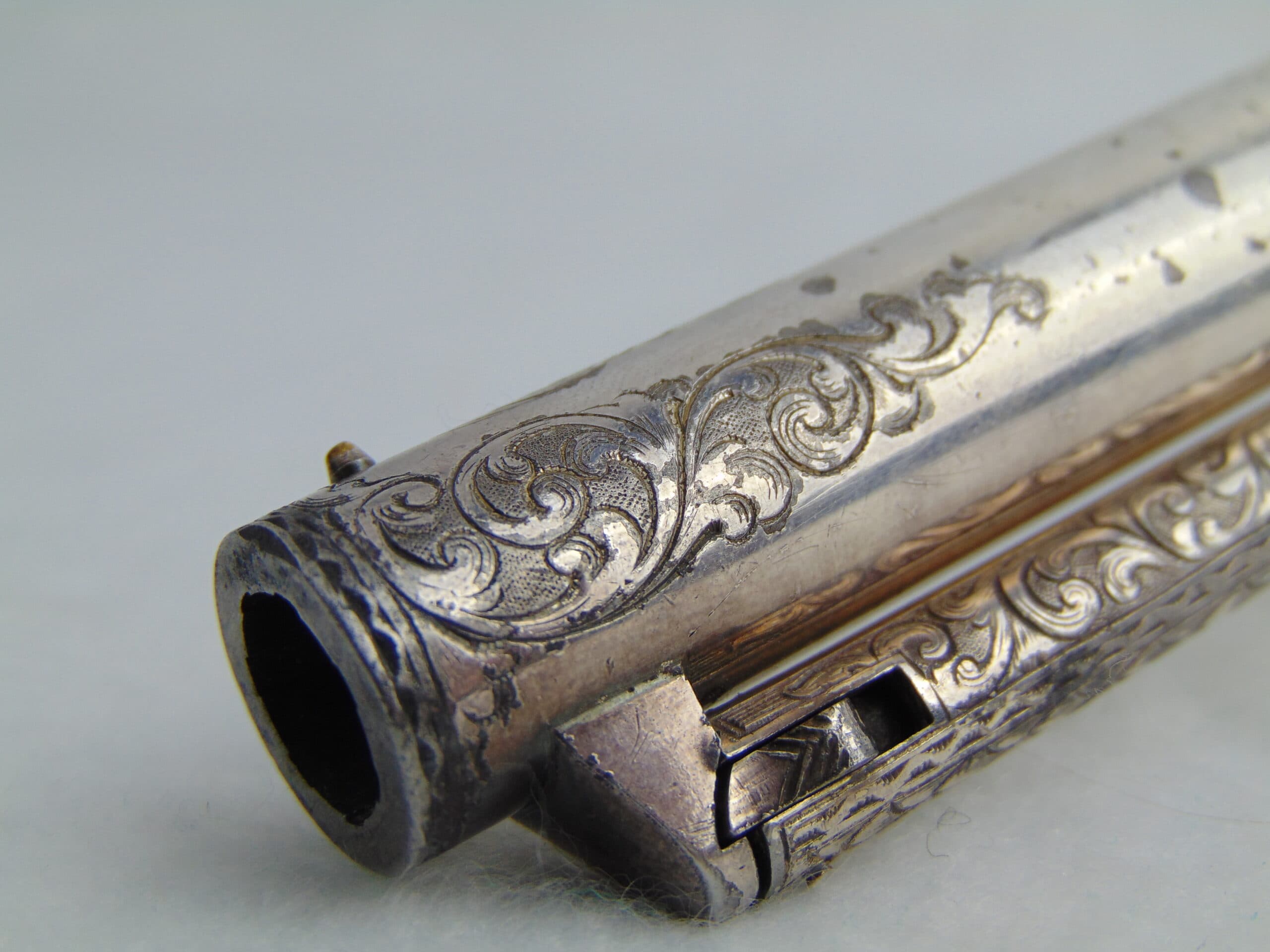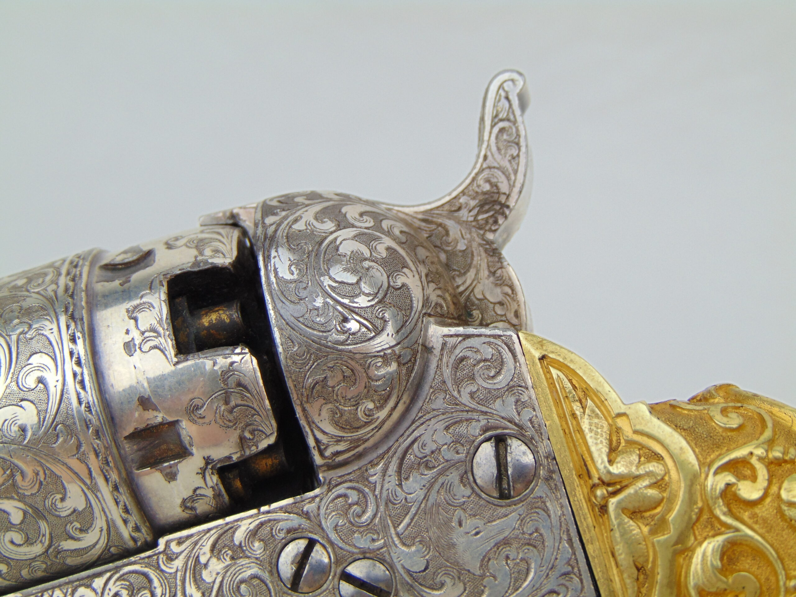 The deluxe engraving on this piece covers approximately ¾ of the gun’s surfaces, including the hammer & loading lever, the latter seldom seen engraved. Bold vine & scroll flow effortlessly throughout, with two areas of the frame & barrel turning into wolf’s head motifs, and a wolf’s head adorns both sides of the hammer. The recoil shield & right side of the barrel each show a single floral petal motif. The atypical round cylinder is fully covered with vine & scroll contained by a wavy line border at the front and rear, while the rebated section shows small scroll accents. The loading lever shows full coverage on the visible parts with vine & scroll, a wavy line border, and a wheat leaf pattern opening up into a fish scale pattern as you go from frame to muzzle on the underside. The same wheat leaf pattern covers the top of the hammer.