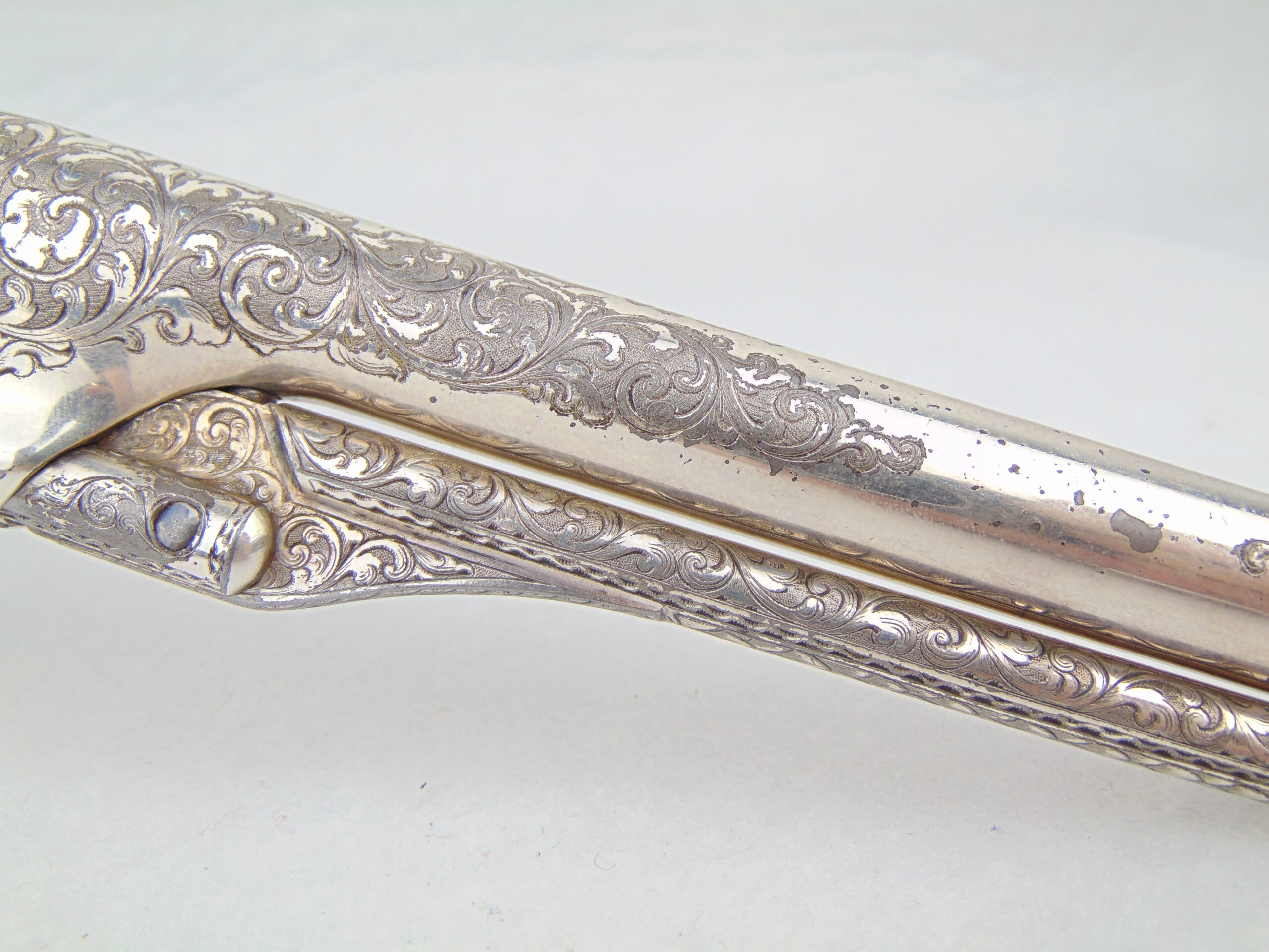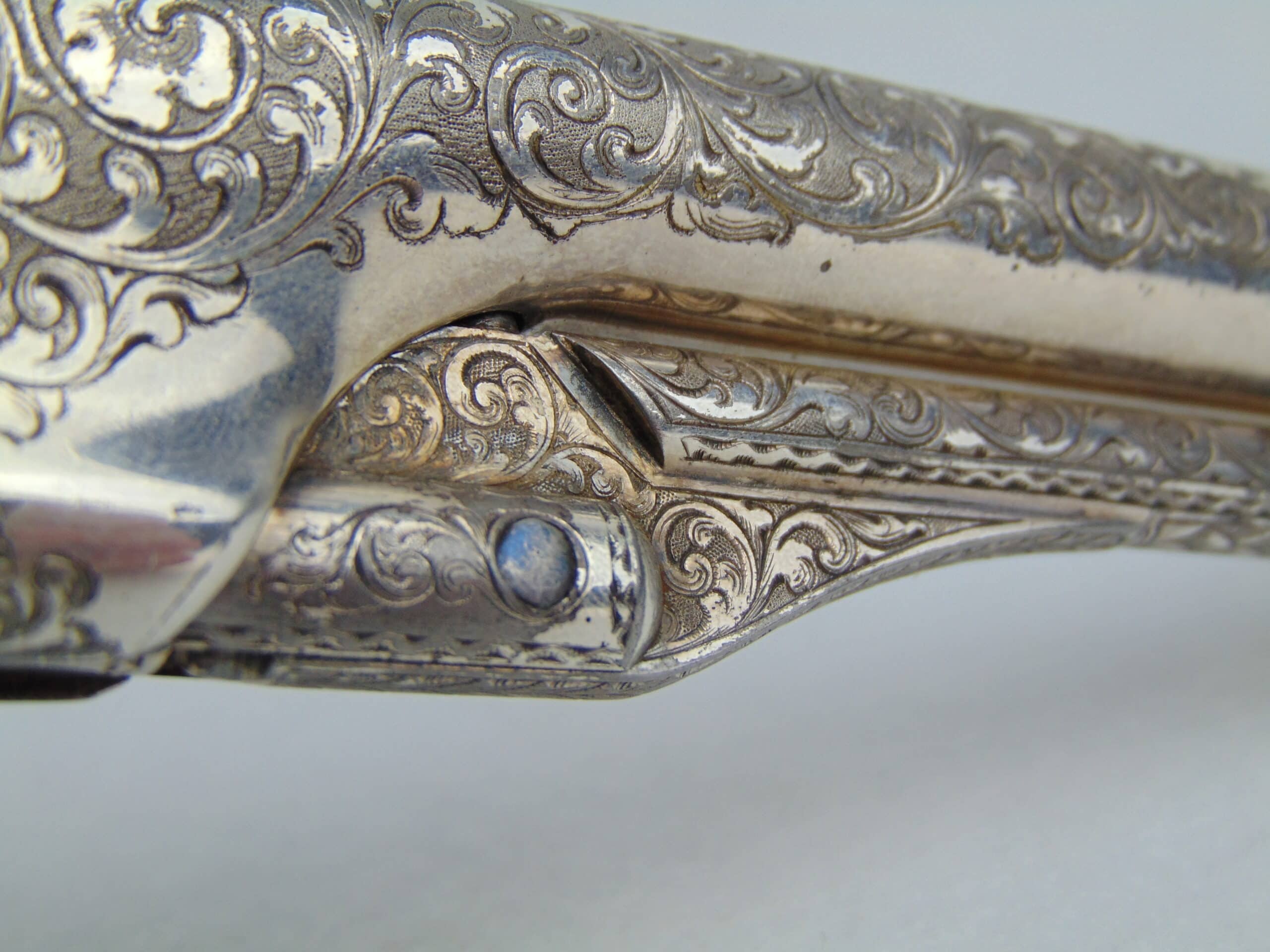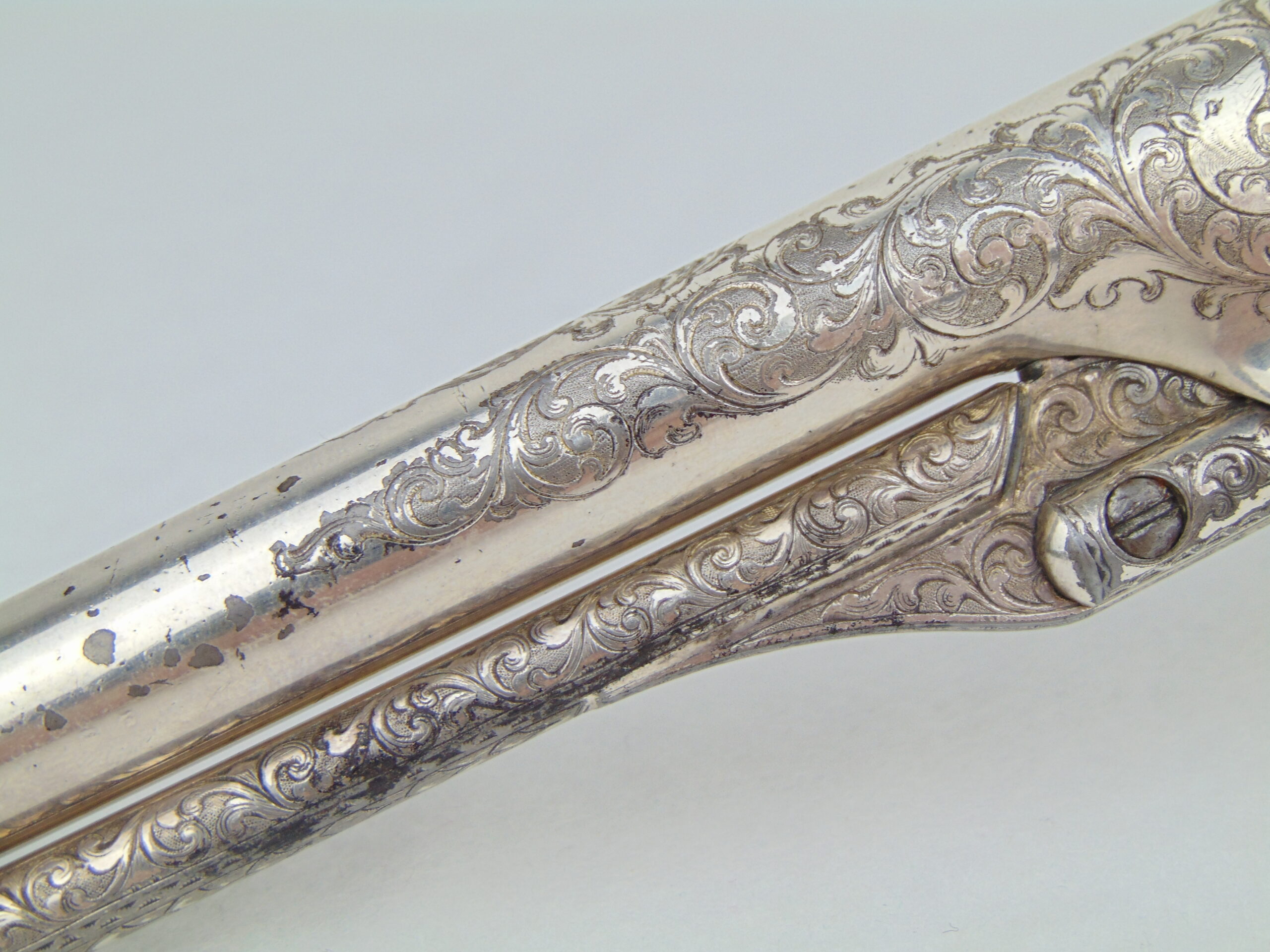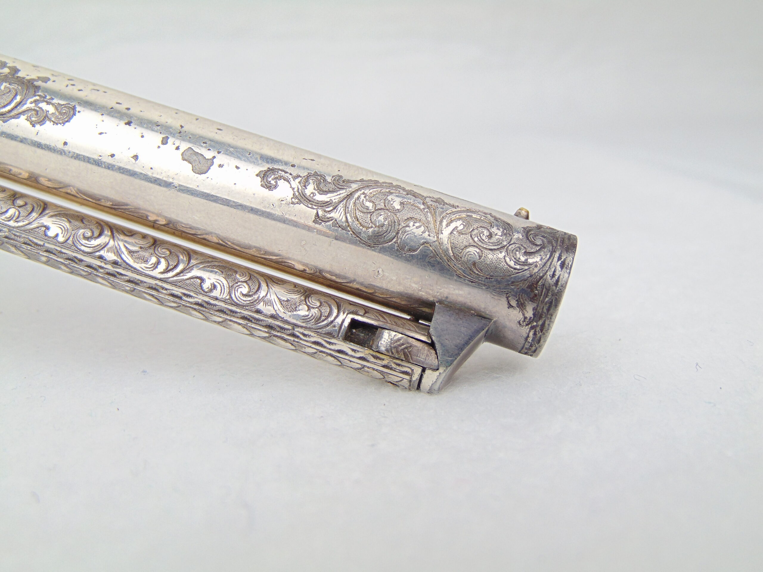 The deluxe engraving on this piece covers approximately ¾ of the gun’s surfaces, including the hammer & loading lever, the latter seldom seen engraved. Bold vine & scroll flow effortlessly throughout, with two areas of the frame & barrel turning into wolf’s head motifs, and a wolf’s head adorns both sides of the hammer. The recoil shield & right side of the barrel each show a single floral petal motif. The atypical round cylinder is fully covered with vine & scroll contained by a wavy line border at the front and rear, while the rebated section shows small scroll accents. The loading lever shows full coverage on the visible parts with vine & scroll, a wavy line border, and a wheat leaf pattern opening up into a fish scale pattern as you go from frame to muzzle on the underside. The same wheat leaf pattern covers the top of the hammer.