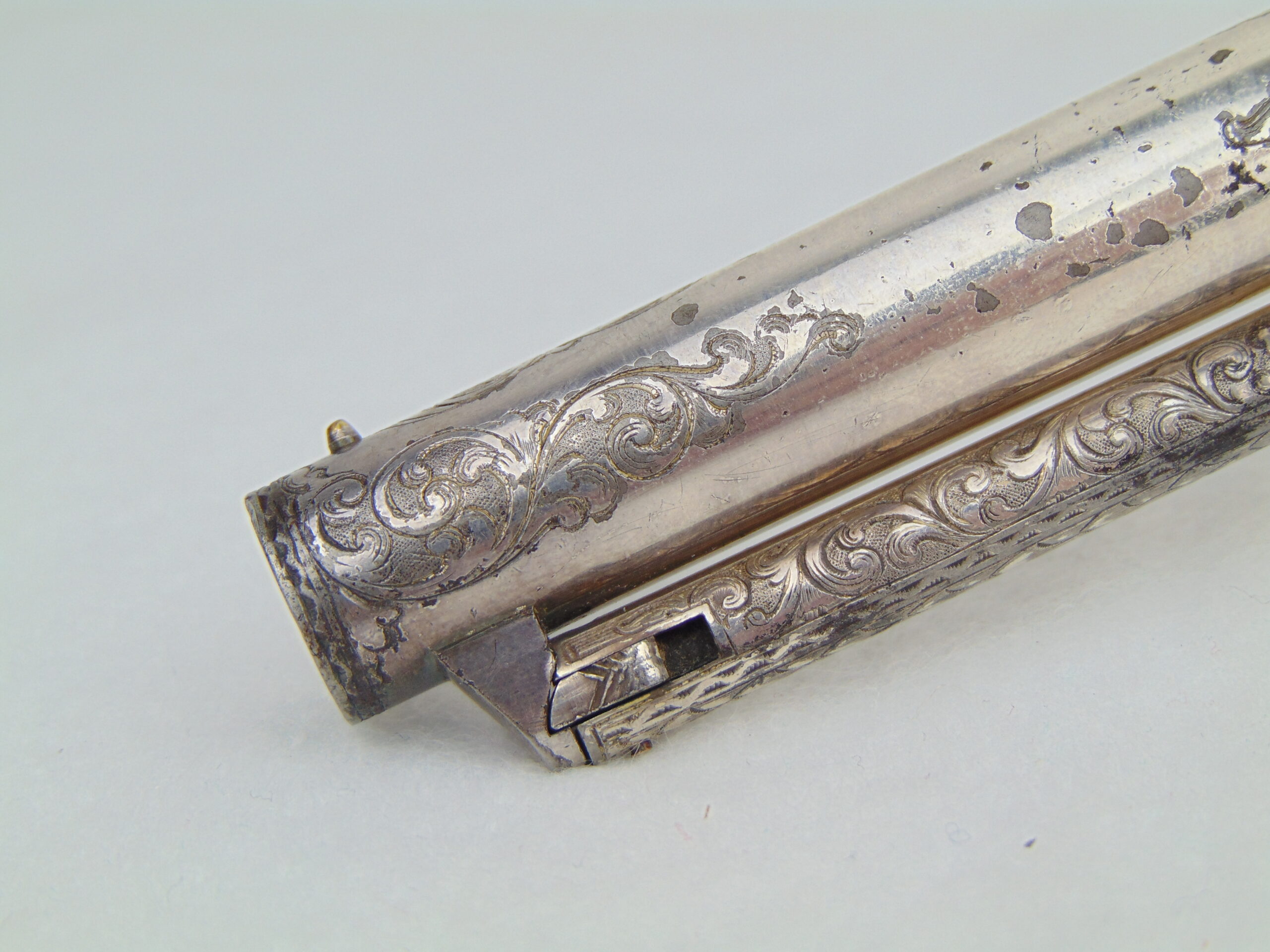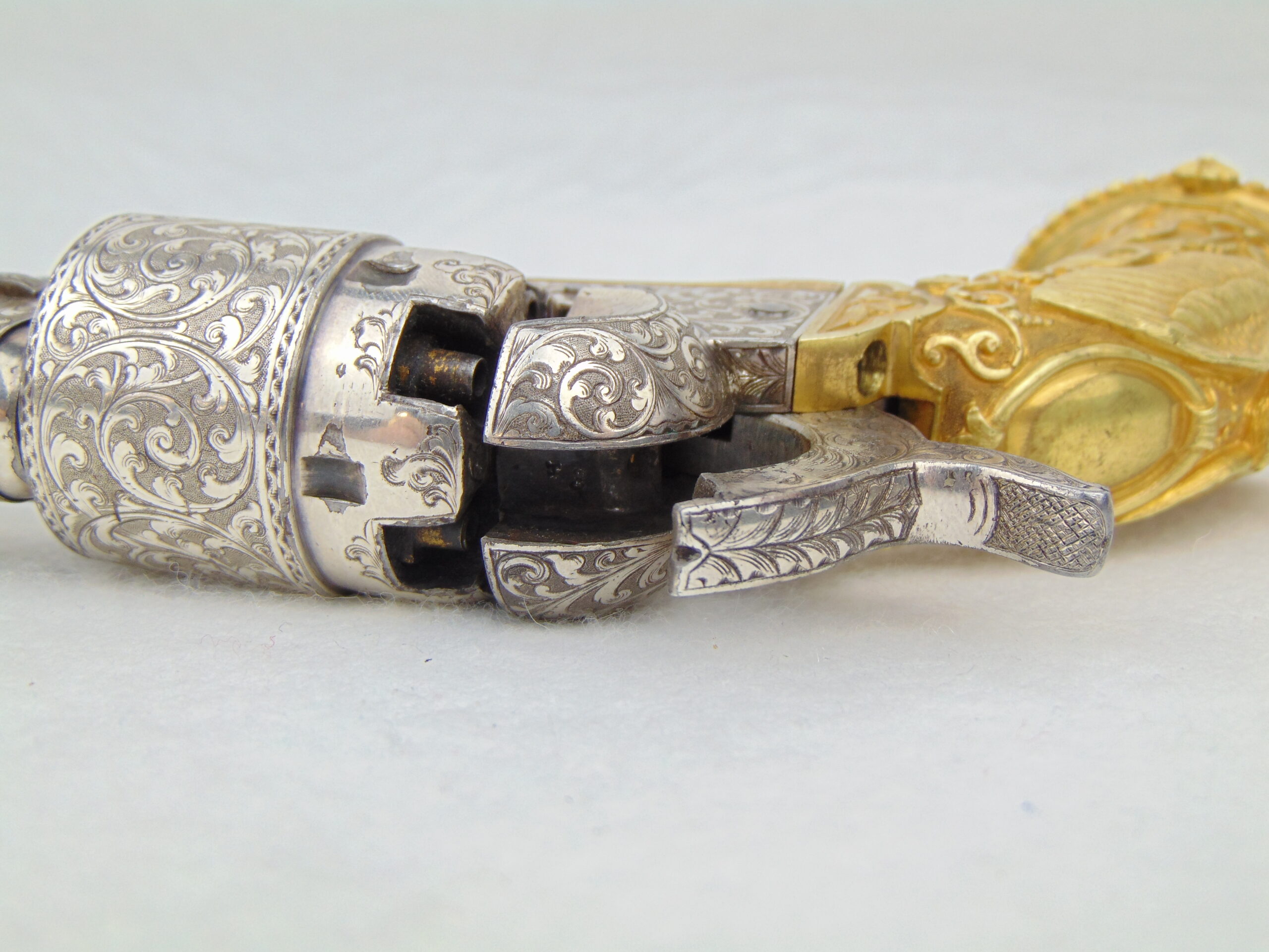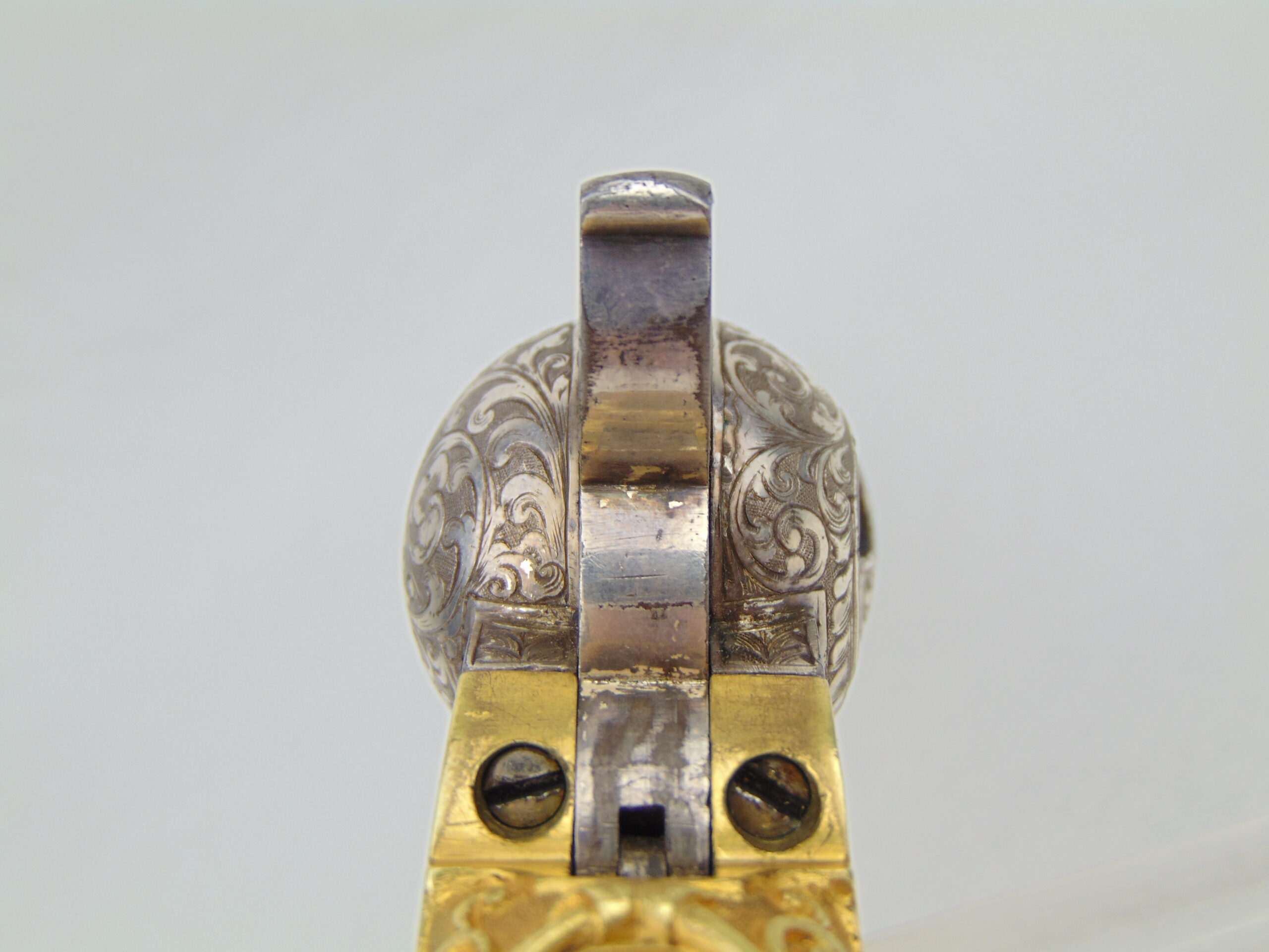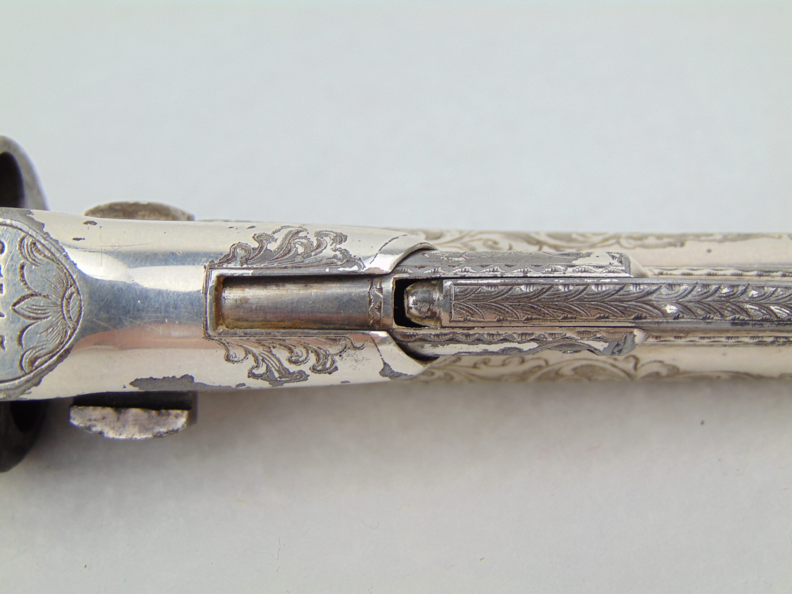 This revolver retains a significant portion of it’s silver plating, with some loss & tarnish, with trace gold plating remaining on the nipples. The finish is well preserved and has no major damage.