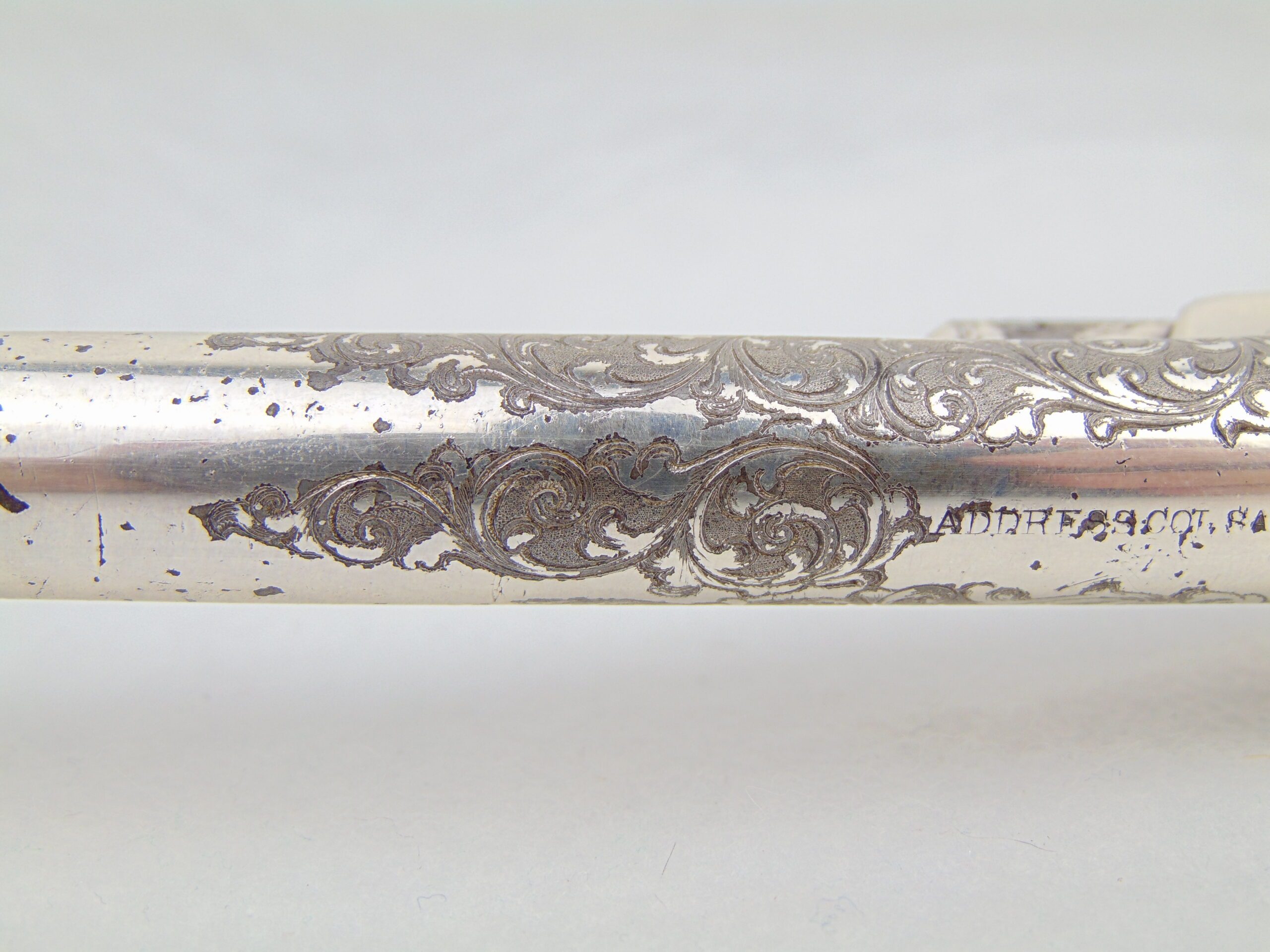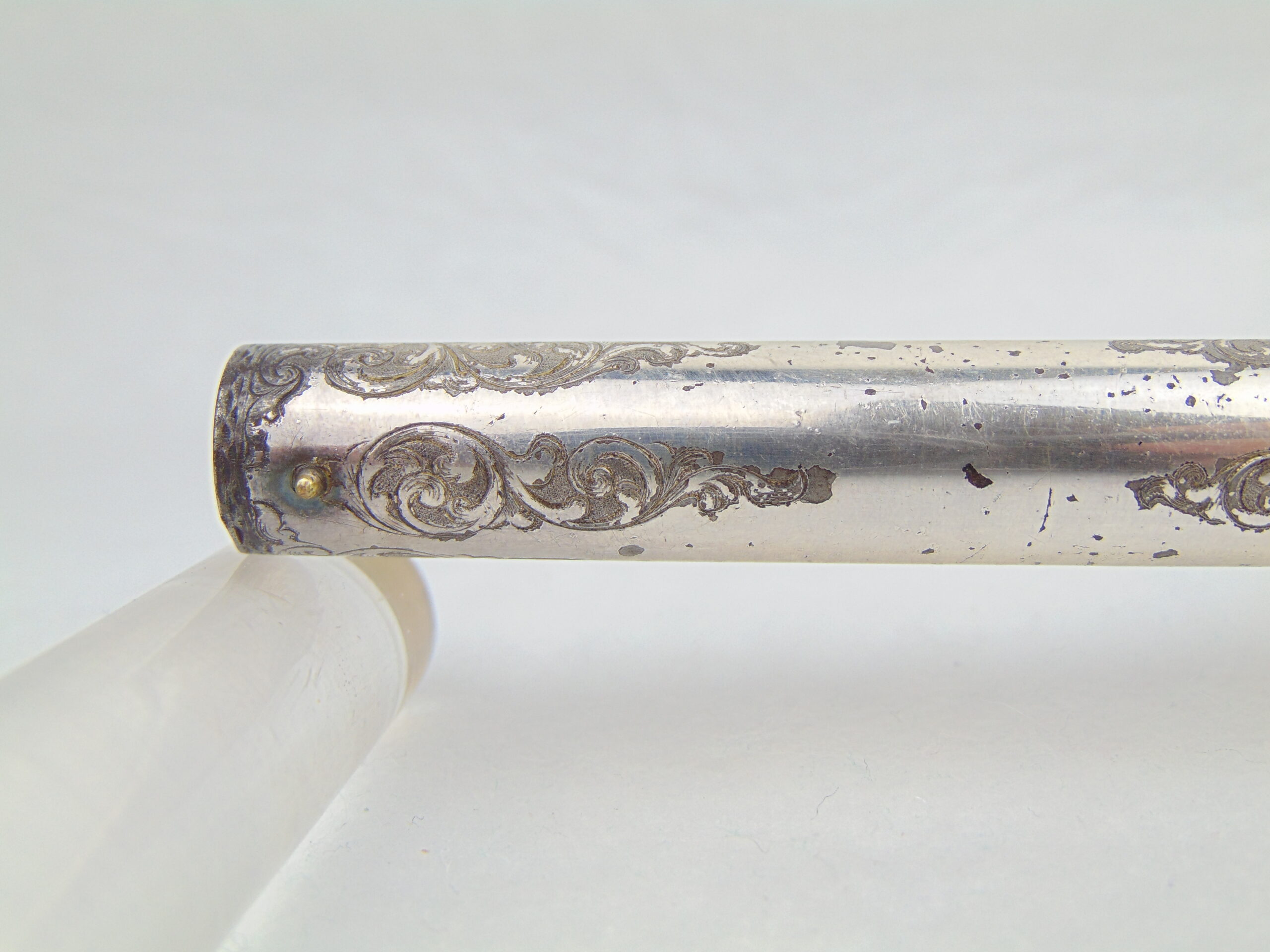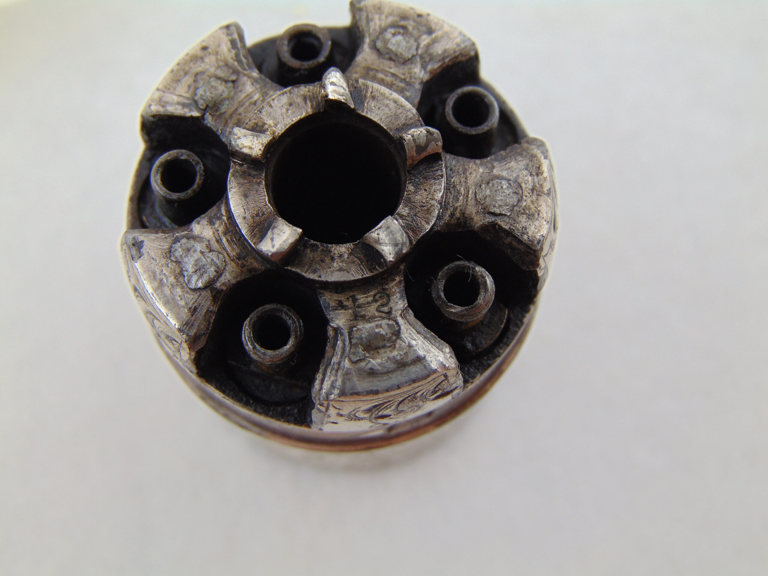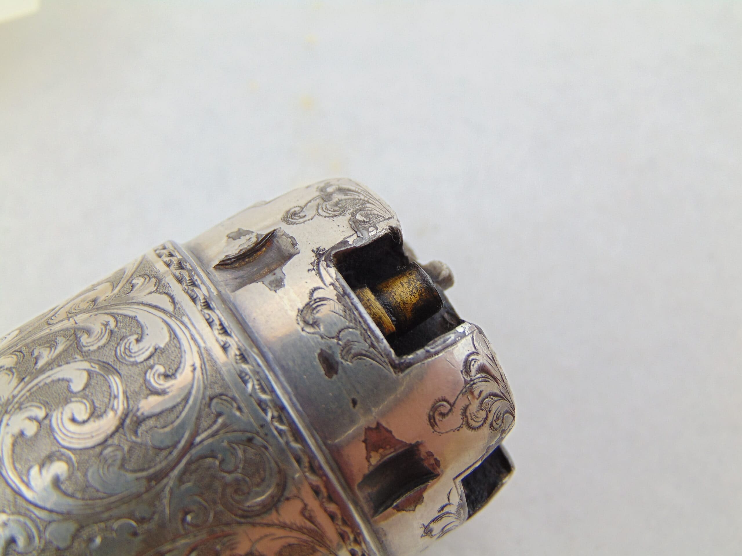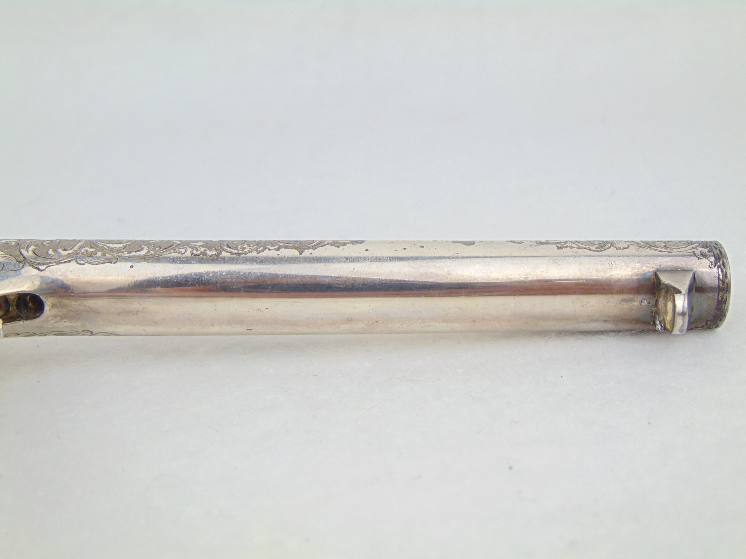 This revolver retains a significant portion of it’s silver plating, with some loss & tarnish, with trace gold plating remaining on the nipples. The finish is well preserved and has no major damage.