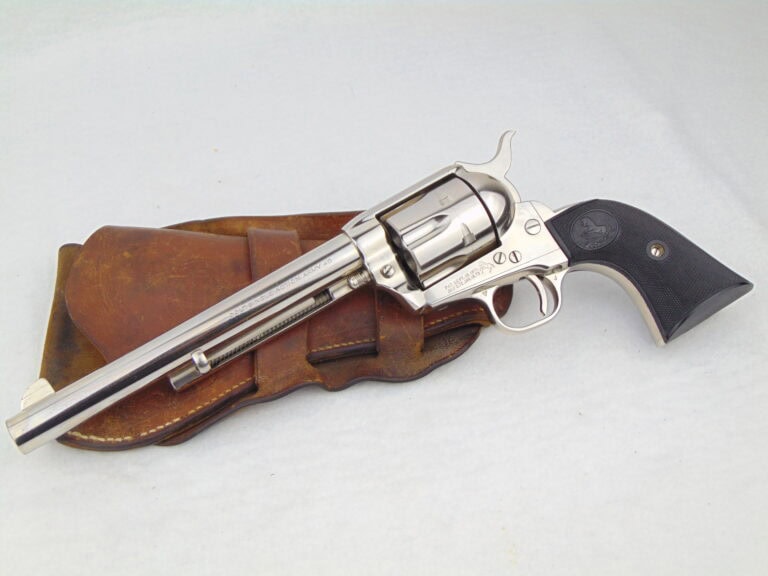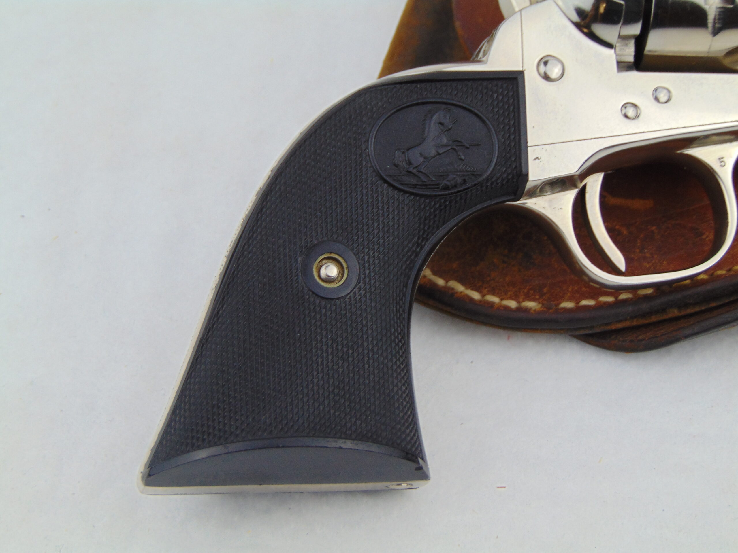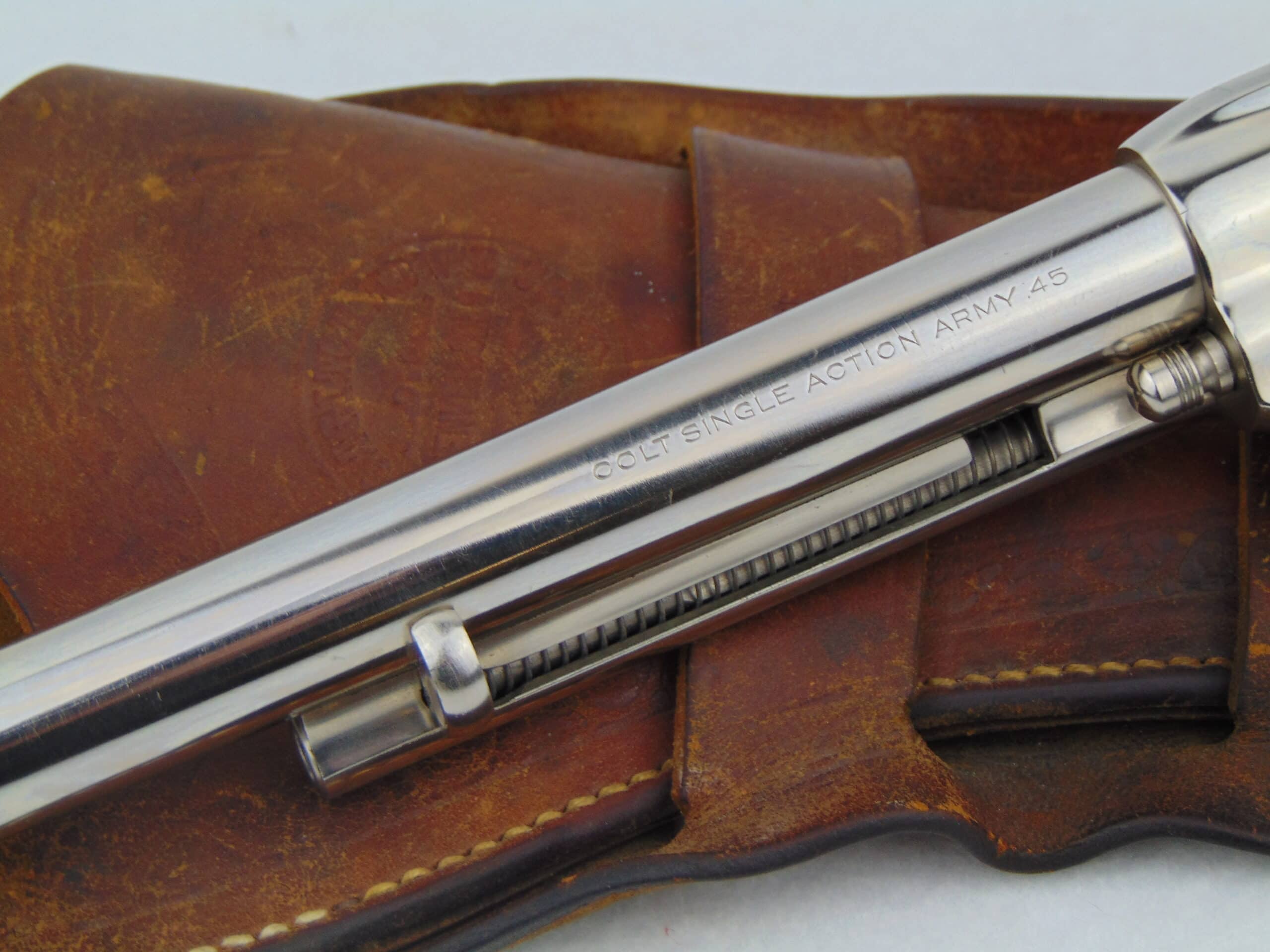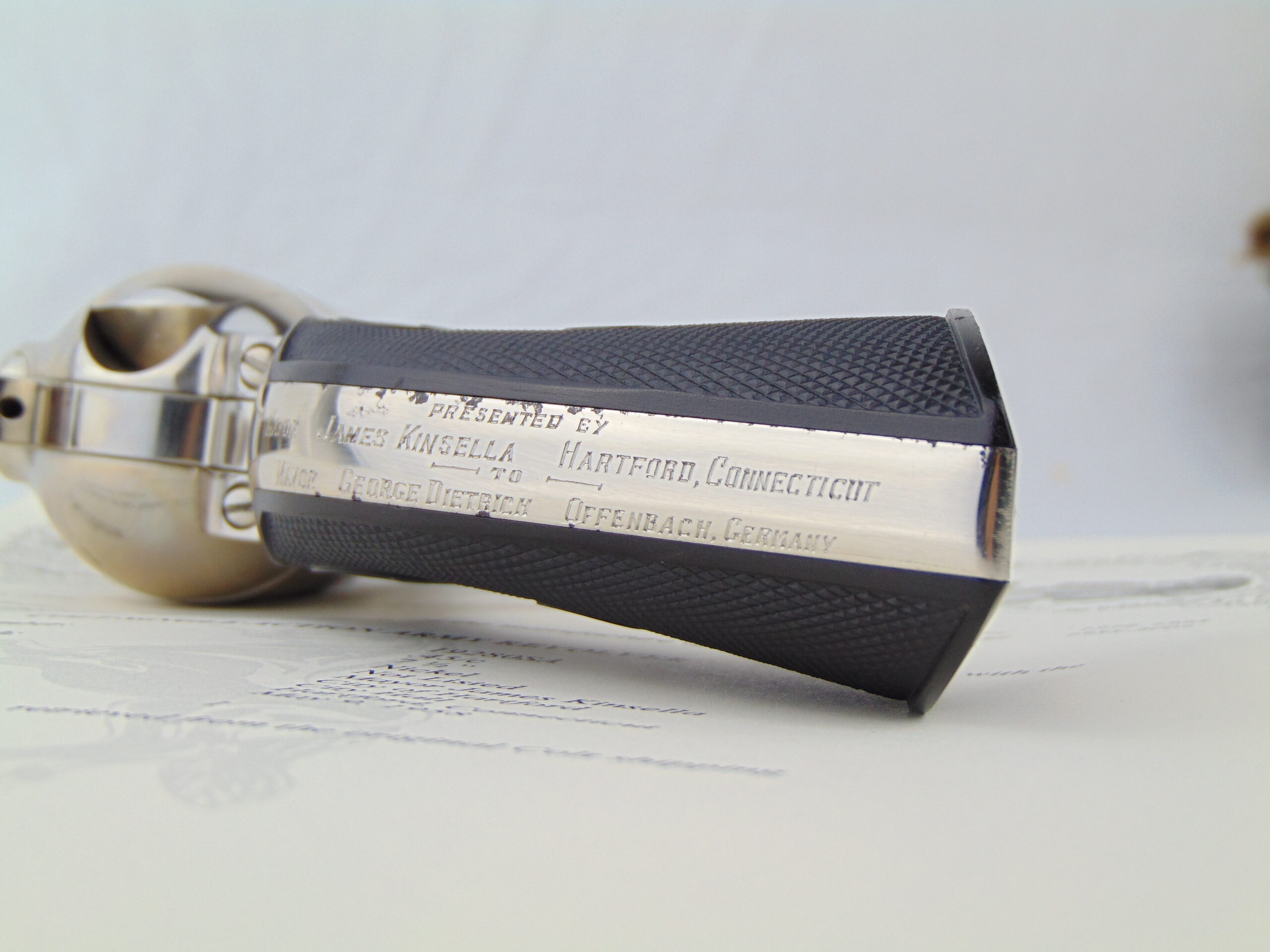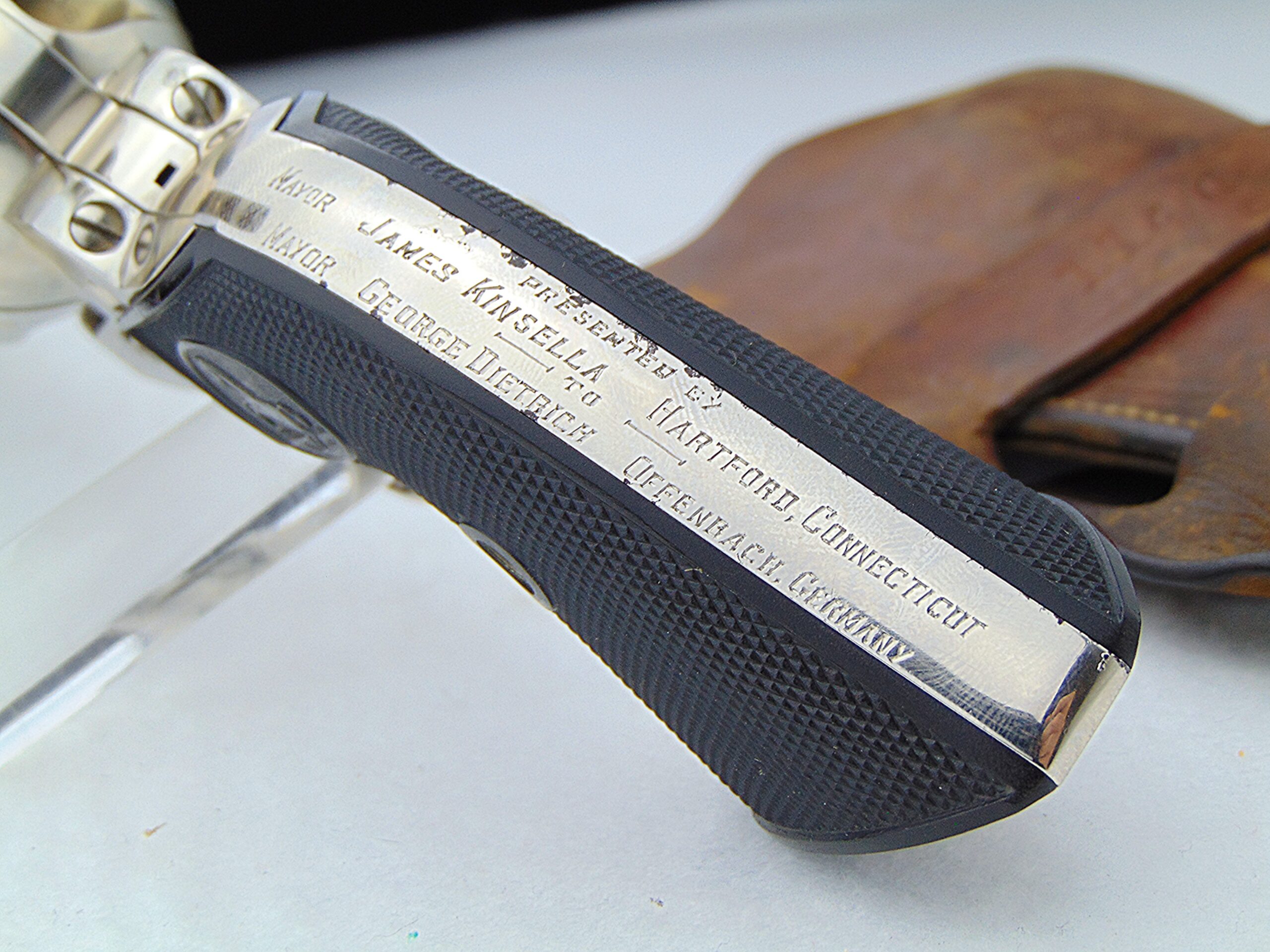 Extremely interesting 2nd Generation Single Action Army presented by Hartford Mayor James Kinsella to Mayor George Dietrich of Offenbach, Germany in 1958. Kinsella’s relationship to Dietrich is unclear, however, Colt factory records also show several other Single Actions intended for presentation from Kinsella to other foreign mayors during this time period, including the mayor of Rio de Janeiro, West Berlin, and also a presentation to then Senator Lyndon Johnson. The purpose of these presentations is unknown.